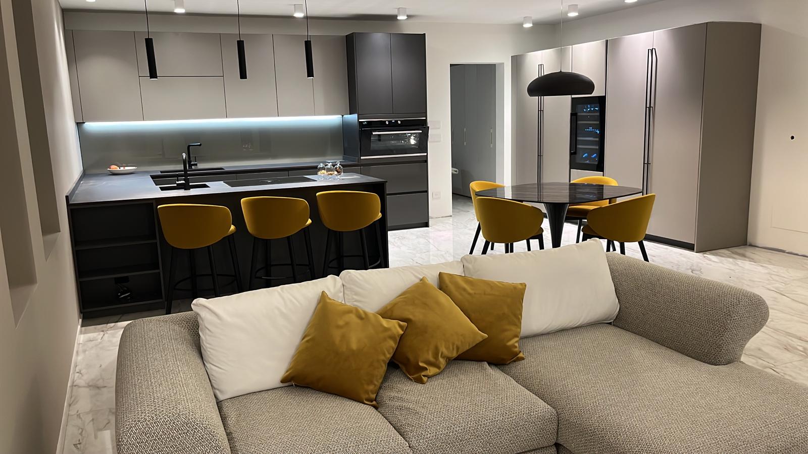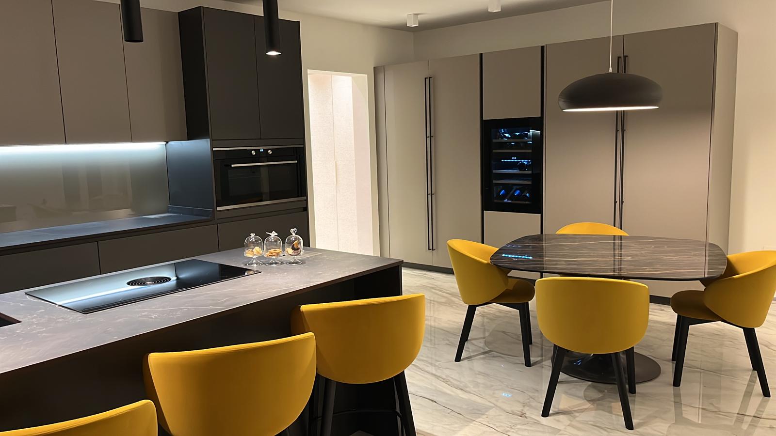 Realizzazione di una cucina Kalì dal design contemporaneo, caratterizzata da linee pulite e finiture raffinate. Il progetto unisce estetica e praticità, creando uno spazio conviviale perfettamente integrato con la zona living.