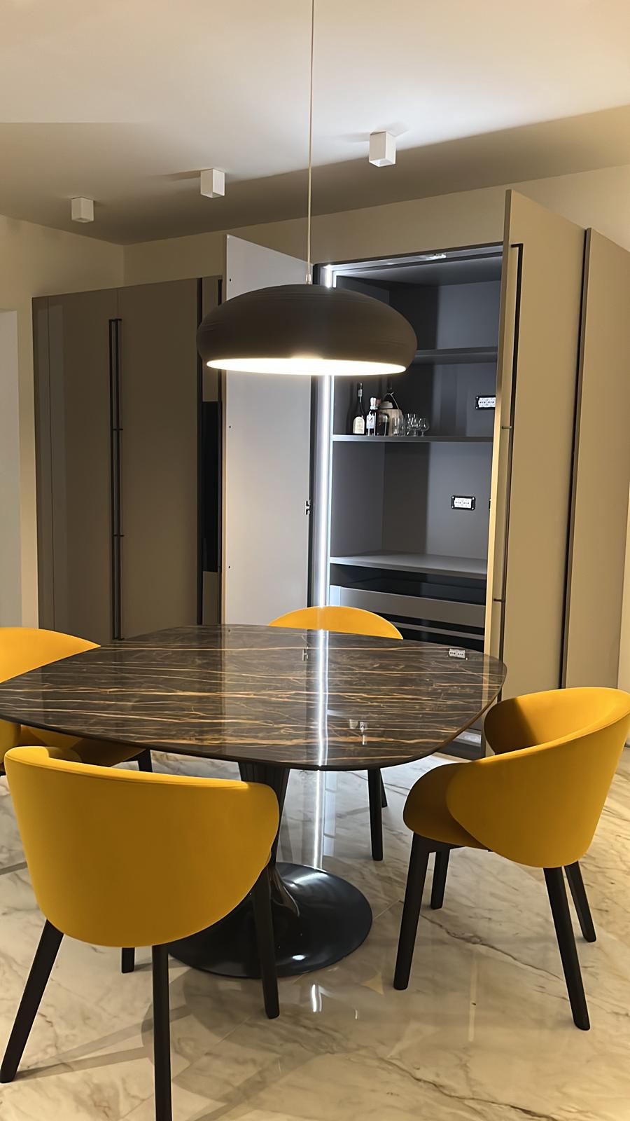 Particolare attenzione è stata dedicata all’illuminazione, che valorizza i volumi e mette in risalto i materiali, creando un’atmosfera calda e sofisticata.