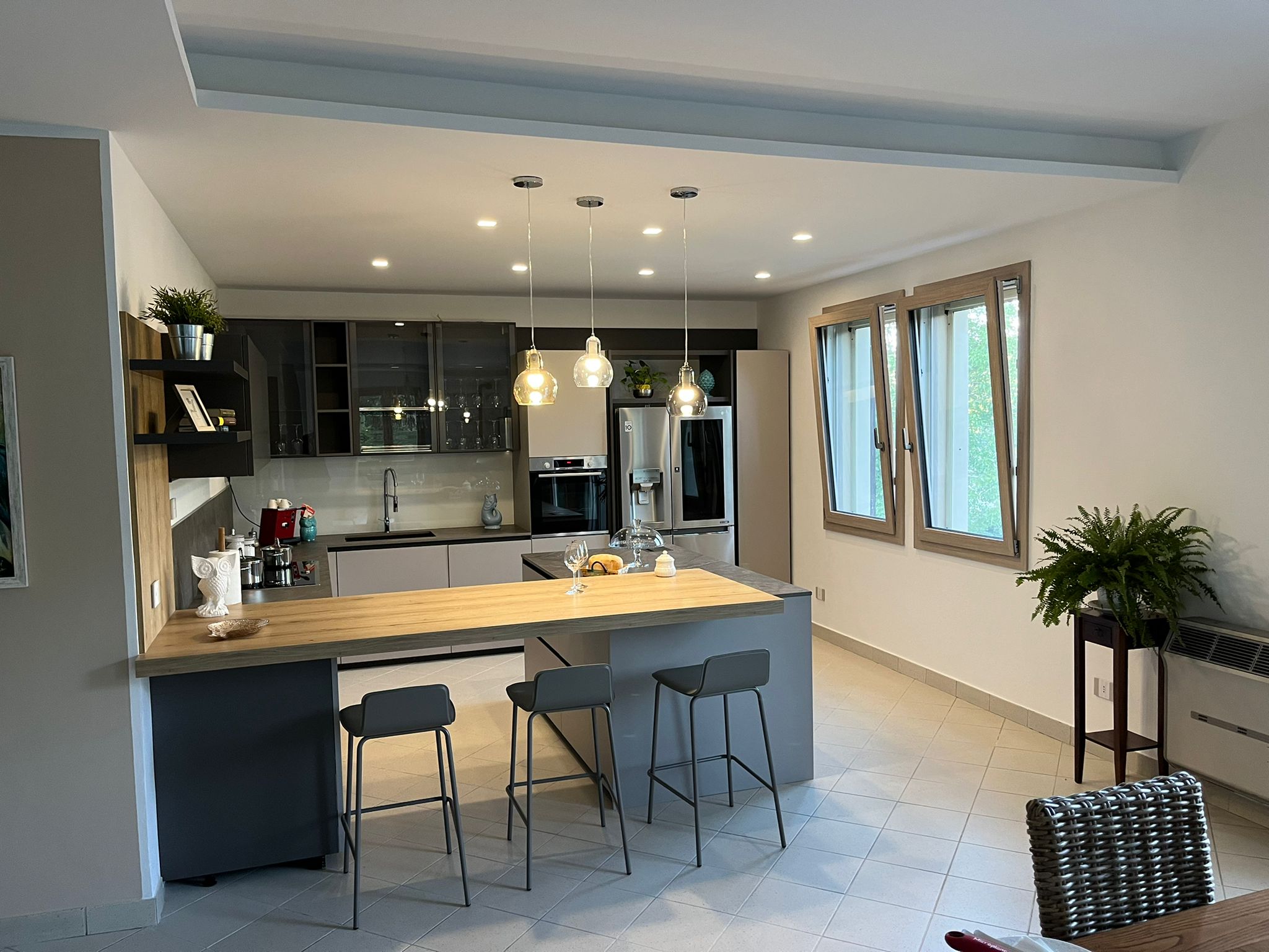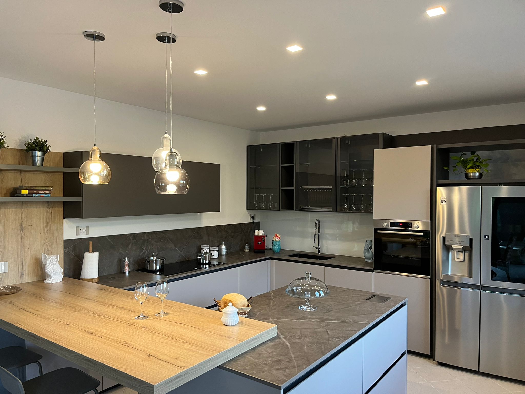 Il controsoffitto diventa parte integrante del progetto grazie a uno studio illuminotecnico preciso. I punti luce incassati e le sospensioni sopra l’isola scandiscono lo spazio e valorizzano le diverse aree funzionali.